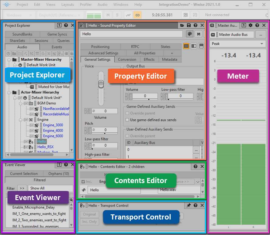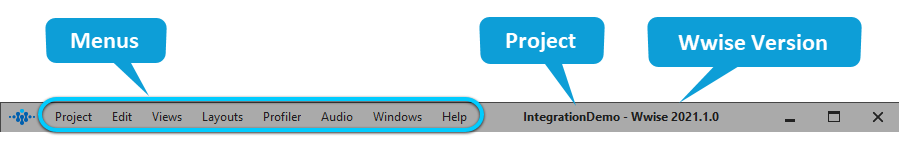 The Wwise interface is divided into several different views. Each view has a specific purpose and gives you access to a series of tools or options that help you manage and define the content for your game. Views are grouped together to create layouts, which facilitate the work involved for a particular task or job. There are different layouts available in Wwise. Refer to Working with Layouts for more information.