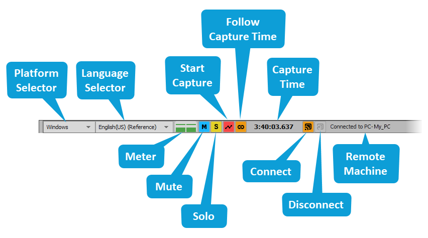 At the top of each layout is the menu bar and toolbar. The menu bar gives you access to all basic information, such as the project name, and commands, such as: saving projects, changing layouts, opening views, and opening help entries for properties. The toolbar provides quick access to certain tools, such as the Platform or Language Selectors, the Capture tools, the Remote Platform Connector, and the Search tool.
