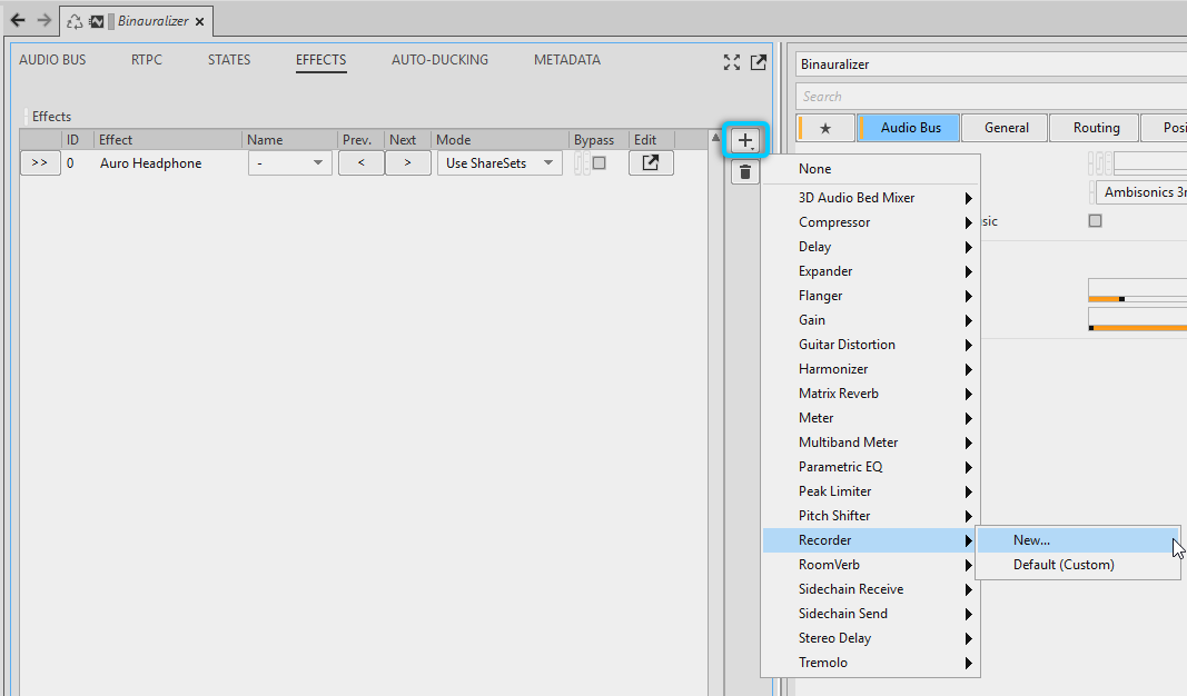 This can be recorded to a single ambisonics file, for later import or for sharing, using a Wwise Recorder plug-in Effect placed on the “Binauralizer” Audio Bus.