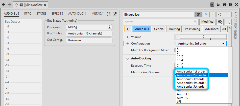 In the General Settings tab of the Property Editor, select Ambisonics 2nd order for second order output (9 channels) or Ambisonics 3rd order for third order output (16 channels).