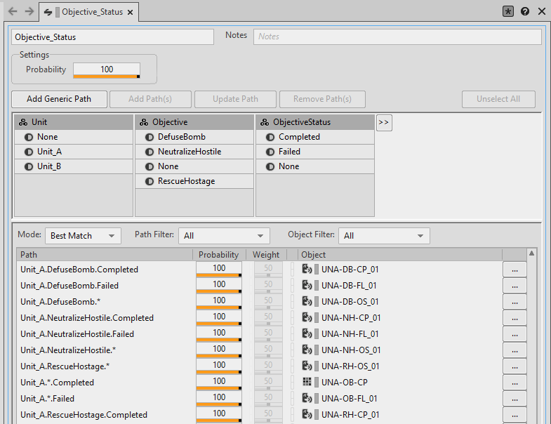 In the Objective column, select either DefuseBomb, NeutralizeHostile, or RescueHostage.