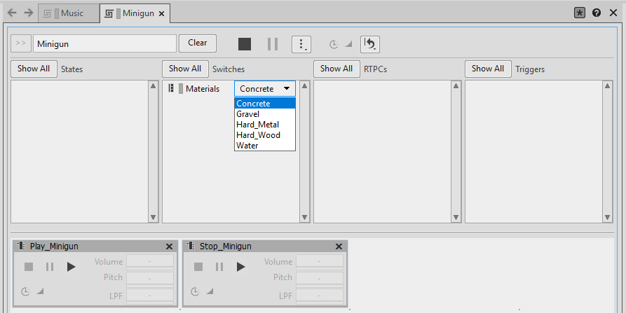 Shell sounds: The sounds of the minigun’s brass hitting the ground is simulated by five Random Containers set to infinitely trigger a new shell sound every 0.1 seconds. These objects are inserted into a Switch Container to play the right Random Container based on the actual material onto which the shells will fall.