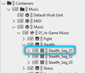 The “01_In-Game Music” music Switch Container holds three music playlist containers, one for each state of the game.