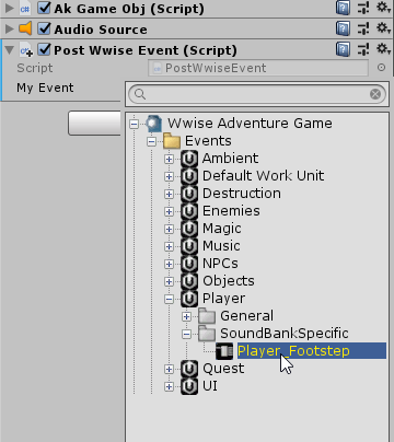 public class PostWwiseEvent : MonoBehaviour { public AK.Wwise.Event MyEvent; // Use this for initialization. void PlayFootstepSound() { MyEvent.Post(gameObject); }