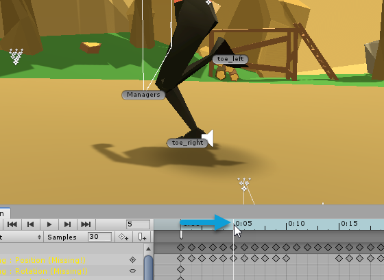 Drag the Timeline Cursor to where the Adventurer is placing her right foot on the ground (0:05).