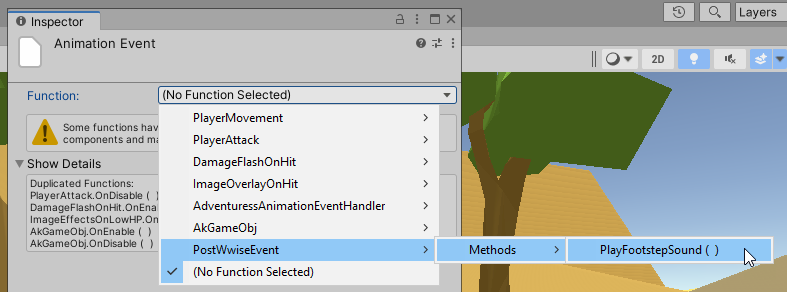 Click the Function property drawer and select PostWwiseEvent > Methods > PlayFootstepSound().