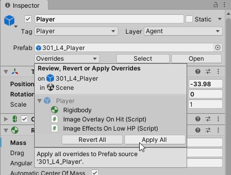 Select the Player game object and in the Inspector, click Overrides > Apply All.