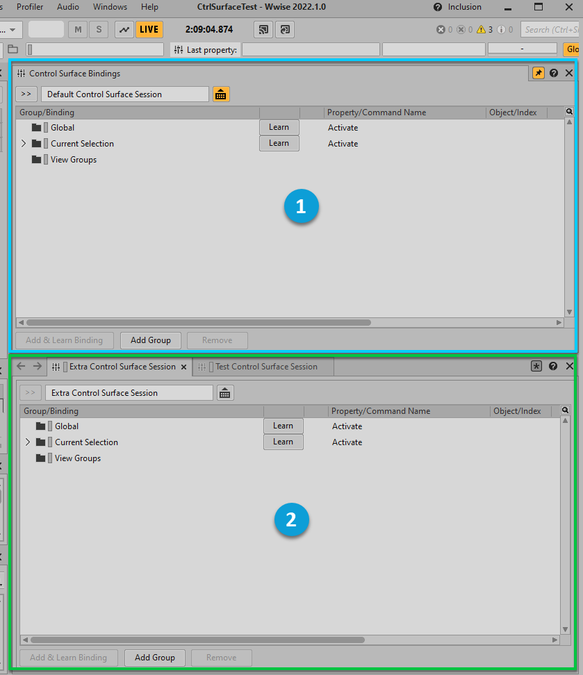 In the following example, the Default Control Surface Session is visible in the Control Surface Bindings view, and two other Control Surface Sessions are visible in Object Tabs. The Default Control Session is active.