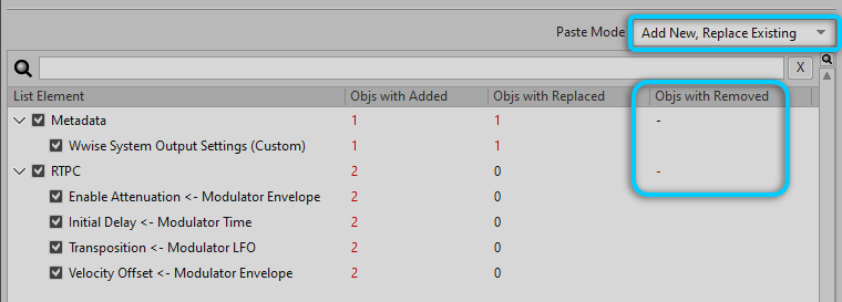 The Properties pane in the top half of the view lists the object properties in the source object. Similarly, the List Element pane displays any RTPCs, Metadata, Stingers, or Music Cues in the source object. The columns at the right of each pane display the number of objects that will change when you click Paste.