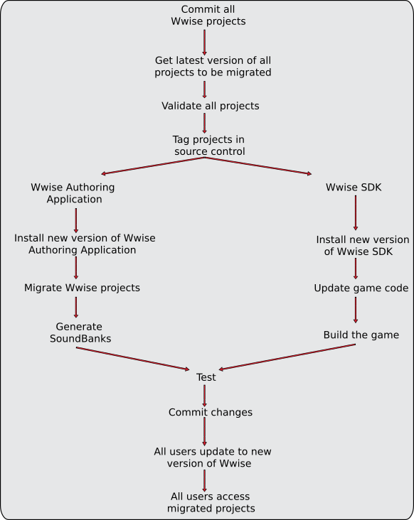 When you are ready to upgrade to a new major version of Wwise, you must follow a coordinated protocol to ensure that your projects created in an earlier version are migrated smoothly to the later version. The goal is to avoid putting any aspect of your game at risk, so you must examine the changes in the new version and selectively and systematically implement any modifications to your game code.