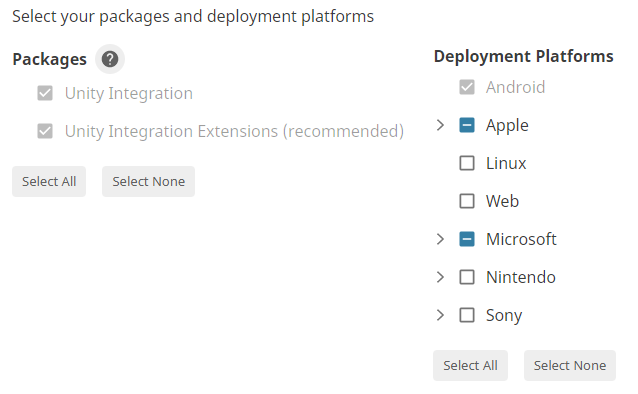Under Deployment Platforms, select all platforms supported by the Unity Editor installation used to create your Unity project.