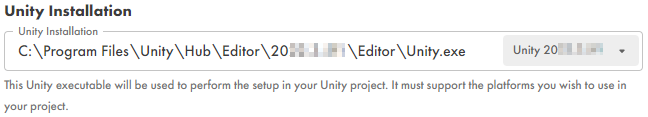 Specify the Unity Installation location for the selected Unity version. It must match the Unity version used by the Unity project. If you want to use another version, you should migrate your Unity project to the desired Unity version before integrating Wwise into your project.