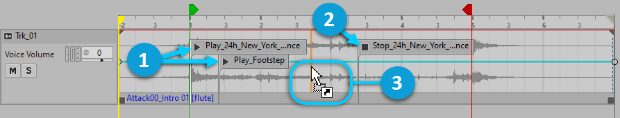 Eventキューが、ミュージックトラック上に小さなフラグとして表示されます。