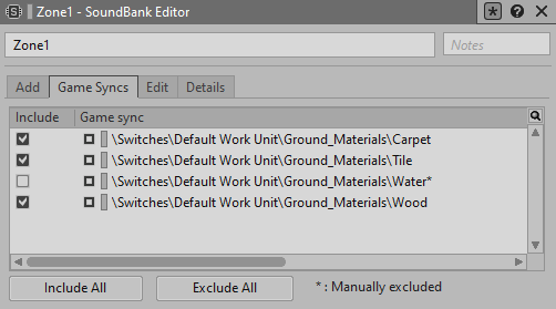 ゲーム中にSwitch「Water」が使われるのは、Zone 2とZone 3だけで、他の3種類のSwitchは、3つの全てのゾーンで使われるとします。SoundBankはゾーンごとに1つずつ定義したため、3つあります。Switch ContainerはどのSoundBankにも含める(Include)必要がありますが、Zone 1のSoundBankからは、水(Water)関連のイベント、サウンド構造、そしてメディアファイルを全て、除外します。手順としては、Zone 1用のSoundBankをロードしてから、Game Syncsタブに切り替えて、Switch「Water」の選択を外します。