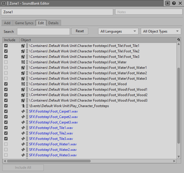 これで、SoundBank「Zone1(ゾーン1)」から、水(Water)関連のサウンド構造やメディアファイルが除外されます。Editタブに切り替えると、このSwitch「Water」をレファレンスする全てのサウンド構造、イベント、メディアファイルが、このSoundBankに含まれないようになっています。