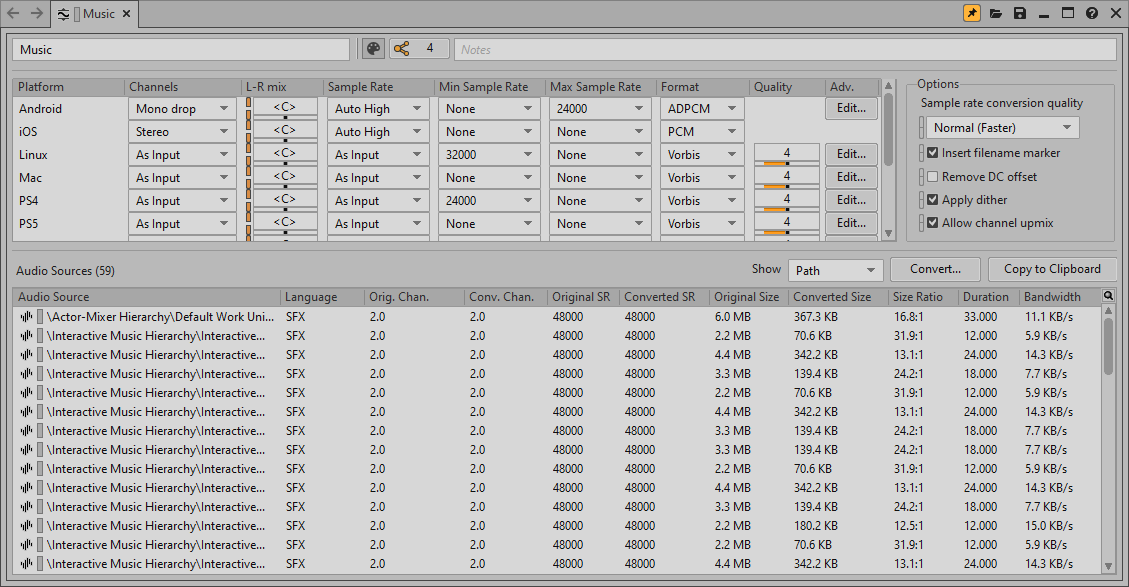 Settings: Audio Sourcesの上のエリア。サンプルレート(Sample Rate)、オーディオフォーマット(Format)、チャンネル数(Channels)などのコンバージョンの詳細をプラットフォーム別に設定する。