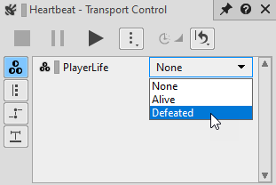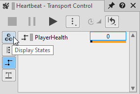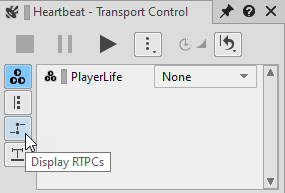 Transport Control에서 Display RTPCs 버튼을 선택하고 PlayerHealth 값을 0으로 설정하세요. 이렇게 하면 5단원: Game Parameter 사용하기에서 설정한 곡선에 관계없이 심장 박동 사운드가 명확하게 들리게 됩니다.