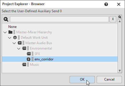 Project Explorer - Browser에서 env_corridor Auxiliary Bus를 선택하고 OK를 클릭하세요.