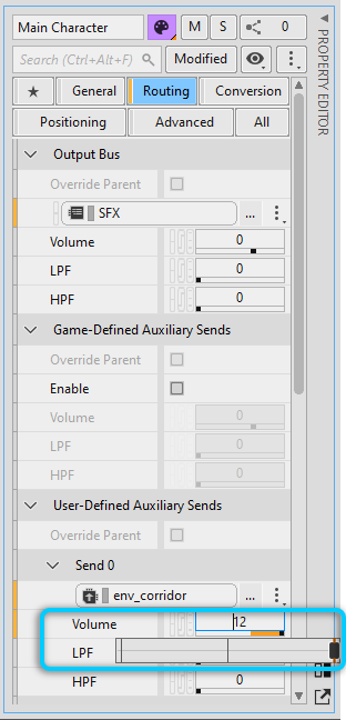 이제 게임을 플레이하면 Main Character Actor-Mixer에 담긴 오브젝트가 env_corridor 보조 센드를 높이고 낮출 시기를 나타내는 Wwise 게임 호출을 인식할 수 있습니다.