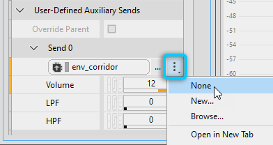 Project Explorer에서 Main Character Actor_Mixer를 선택하세요. 그리고 Property Editor에서 Send 0 에서 More options 버튼을 선택하고 None을 클릭하세요.