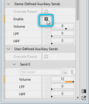 Game-Defined Auxiliary Sends 아래에서 Enable 체크 상자를 선택하세요.