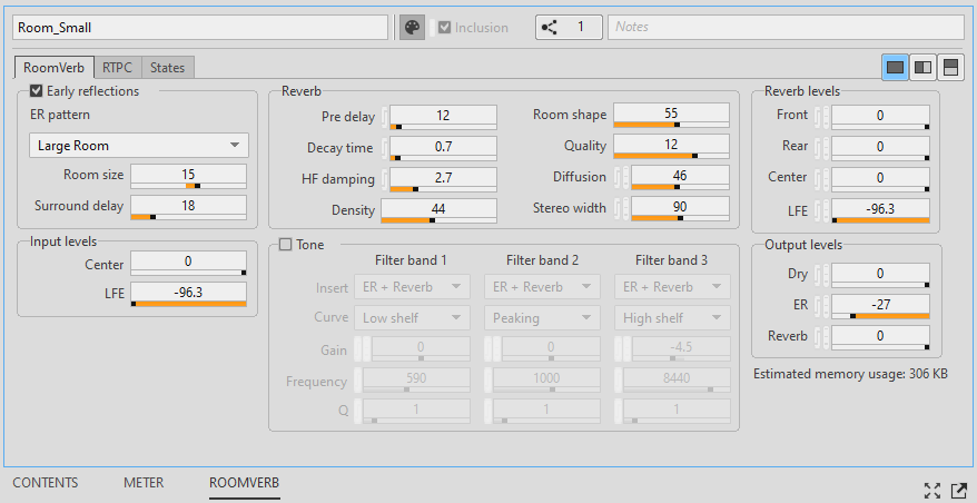 Wwise로 돌아가세요. Master-Mixer Hierarchy에서 env_corridor 보조 버스를 선택하세요. 보조 편집기의 RoomVerb 설정에서 Decay time과 HF damping을 조정해 소리를 원하는 대로 바꿔보세요.