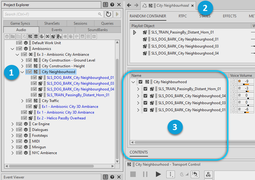 Project Explorer의 Audio 탭에서 오브젝트를 선택합니다.