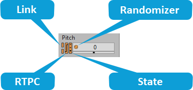 Property Editor에서 속성값을 변경할 경우 랜더마이저(randomizer)를 적용하거나, 여러 플랫폼에서의 속성값을 연결/연결 해제할 수 있습니다. Wwise에서는 각기 다른 아이콘을 사용하여 이런 기능들을 표시합니다. 또한 Wwise는 RTPC를 통해 속성값이 Game Parameter에 연결되었는지도 보여줍니다. 다음 표에서는 각 아이콘을 설명합니다.