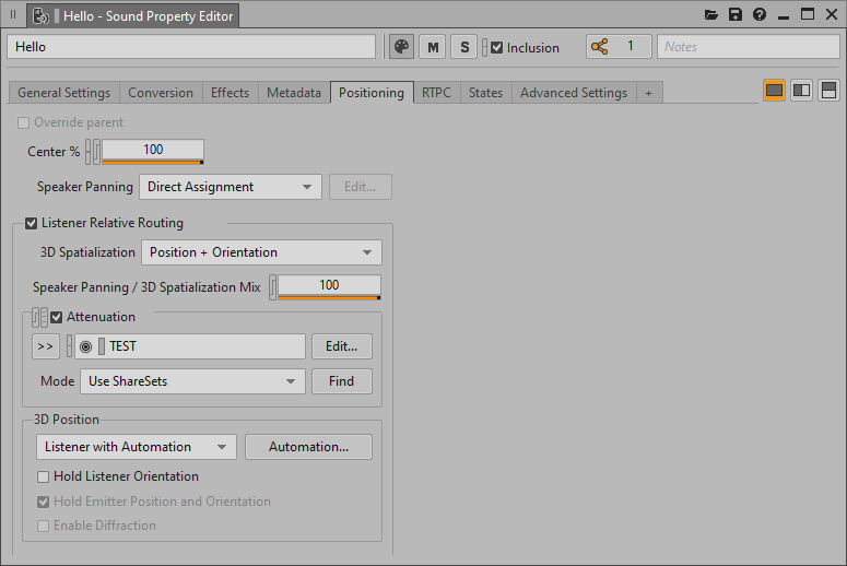 Positioning 탭은 프로젝트 오브젝트의 위치 지정 특성을 확인하고 정의할 수 있는 여러 옵션을 담고 있습니다. 오브젝트가 스피커 패닝 혹은 3D 위치 지정만 사용하거나 둘 다 조합하여 사용하도록 설정할 수 있습니다. 그런 다음 각 위치 지정 유형을 구현할 방법을 정의할 수 있습니다. 그리고 중앙 스피커에서 재생할 오디오를 백분율로 지정하여 오브젝트의 오디오 처리량을 설정할 수 있습니다.