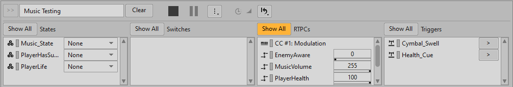 Soundcaster 세션에 모듈을 추가하고 어떤 Wwise 오브젝트를 재생할지 결정했다면 재생 도중에 State를 활성화할 수 있습니다. Soundcaster에 오브젝트를 드래그하면 해당 Wwise 오브젝트와 관련된 State Group과 State가 활성화되며 States 목록에 추가됩니다. 표시되는 State가 없을 경우 Show All을 클릭하세요. 그러면 모든 State Group과 State가 States 영역에 표시됩니다. State 만들기와 State에 오브젝트 할당하기에 대해 더 알아보려면 다음 섹션을 참조하세요.