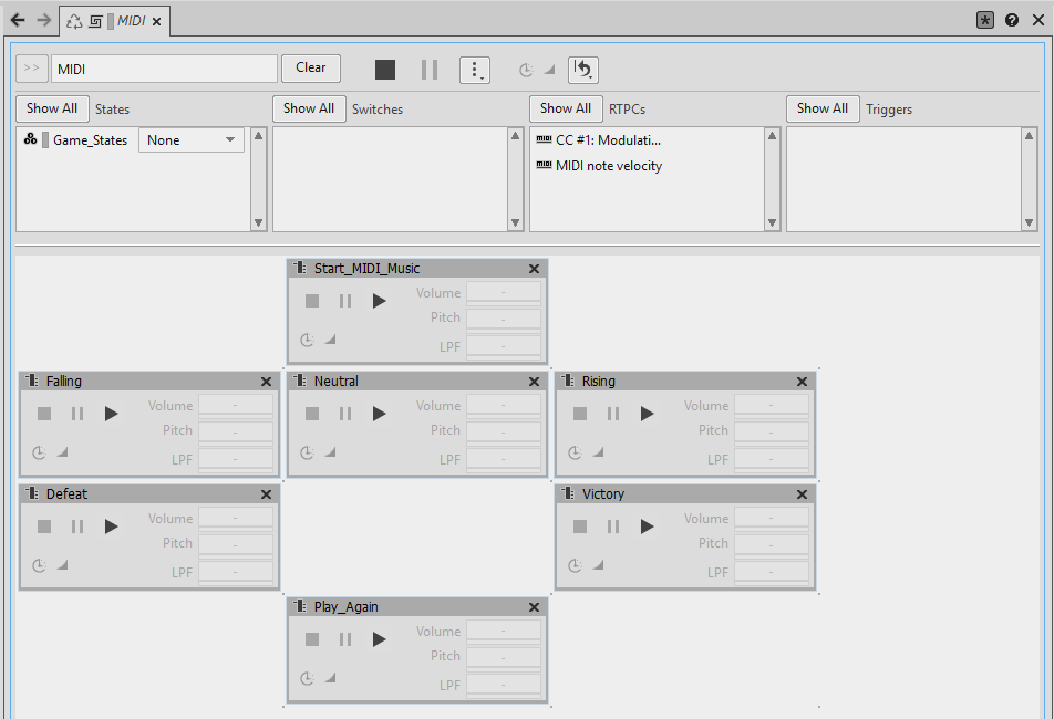 You can listen to the various states by using the Soundcaster session "MIDI". Start by playing the "Start_MIDI_Music" Event in the Soundcaster session, and then trigger the other Events in this session to change from state to state.