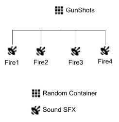 Containers are used to group the sound objects within your project. They are mainly used to play a group of objects according to a certain behavior, such as Random, Sequence, or Switch. The following diagram shows four gunshot firing sounds grouped in a Random Container so that a different sound is played each time the gun is fired in game.