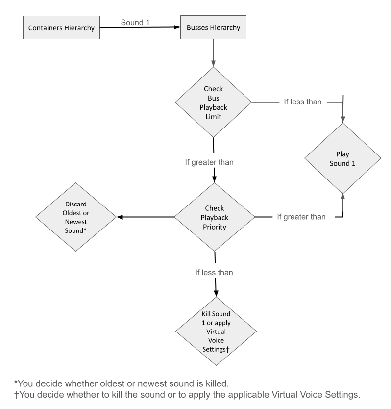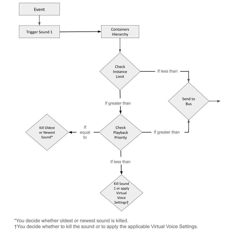 The following flowchart shows how Wwise determines which sound, motion, and music objects within the Containers hierarchy will be played per game object. 실제로 버스로 전송할 각 오브젝트를 궁극적으로 결정하기 전에 다른 상위 오브젝트(각 상위 계층이 자체적으로 제한을 가질 수 있음)를 통해 여러 번 수정을 거칠 수 있습니다.