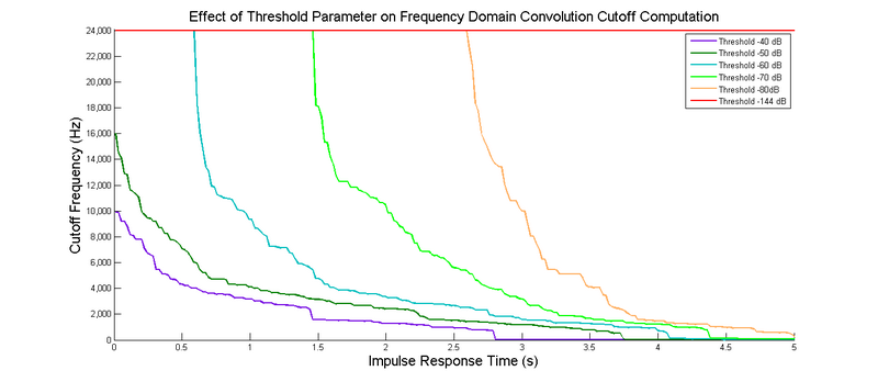Frequency-domain truncation: The threshold parameter can be used to stop processing the convolution at the lowest frequency which falls below the threshold to further reduce the memory and CPU usage of the convolution. For large threshold values, the cutoff frequency detected may change abruptly, leading to artifacts such as frequency sweeping and tail cut. The smoothing parameter can be used to reduce these artifacts by avoiding drastic changes in the impulse response at the expense of reducing the optimization gain. The figures below illustrate the effect of the threshold and smoothing parameters on detected convolution cutoff frequencies.