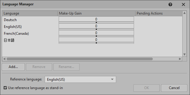 With the Language Manager, you can define the languages used for localization and set a Make-Up Gain (volume offset) for each. You can also set the stand-in reference language. 「Localizing your project」 を参照してください。After a language is defined, you can add audio sources for it. 「Importing language files」 を参照してください。