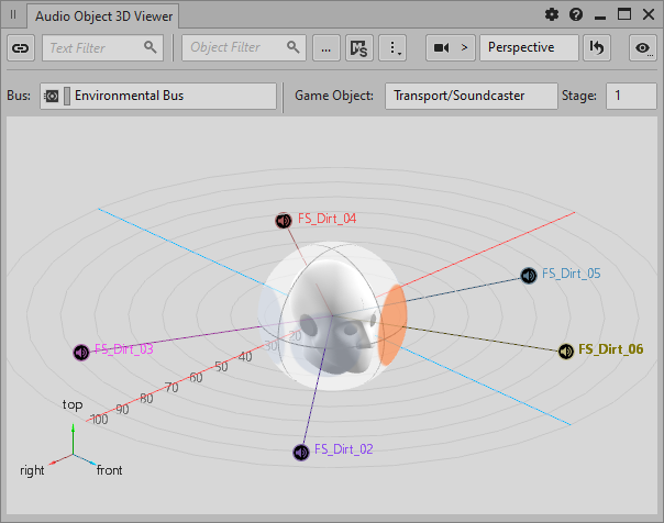 Audio Object 3D Viewer(音频对象 3D 查看器)提供了 Audio Object 相对于听者位置和朝向的详细定位信息。同时,视图中还显示了散布范围(表示为在围绕听者的球体上投射的圆)。您可以通过配置 Audio Object 3D Viewer 来显示不同类型的信息。而且,还可根据需要更改显示设置。