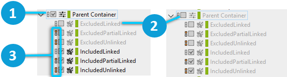 The check boxes for the ExcludedLinked sound object and the Parent Container are not selected. These objects will be excluded from SoundBanks that are generated. All child objects of the Parent Container will also be excluded. |
