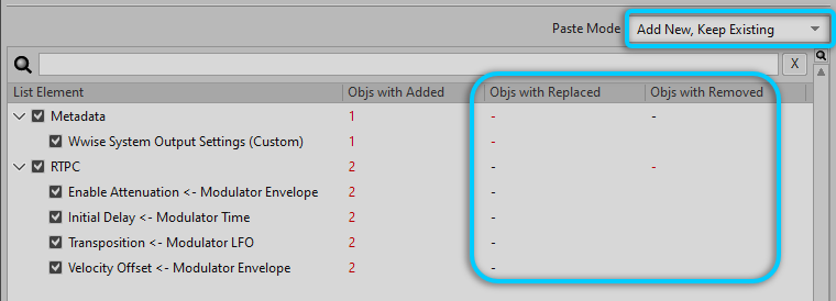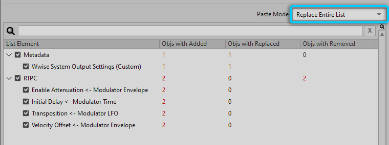 Objs with Replaced 和 Objs with Removed 列中显示的数据会随 Paste Mode(粘贴模式)改变。Paste Mode 决定针对目标对象执行粘贴操作时的效果。倘若不会替换或移除任何条目,则对应列中的数值变为短横线。这表示列数据与所选 Paste Mode 无关。