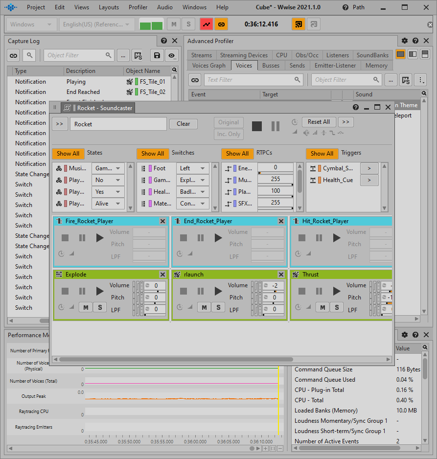 音频集成到游戏中之前,通过在 Soundcaster 中触发事件、声音和振动对象以及游戏同步器,您可以对 Wwise 工程进行多方面的性能分析。
