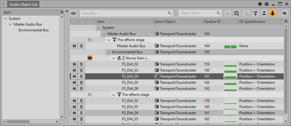 在 Wwise 中,可结合运用以下视图来监控总线管线内 Audio Object 的状态。只需选择 Audio Object Profiler(音频对象性能分析器)布局便可查看所有这些视图。