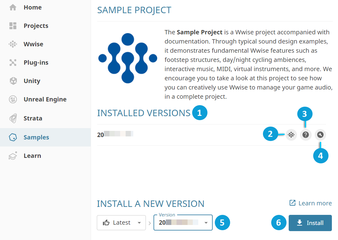 Installed Versions(已经安装的版本):列出已安装的版本。示例针对特定 Wwise 版本分发。 |