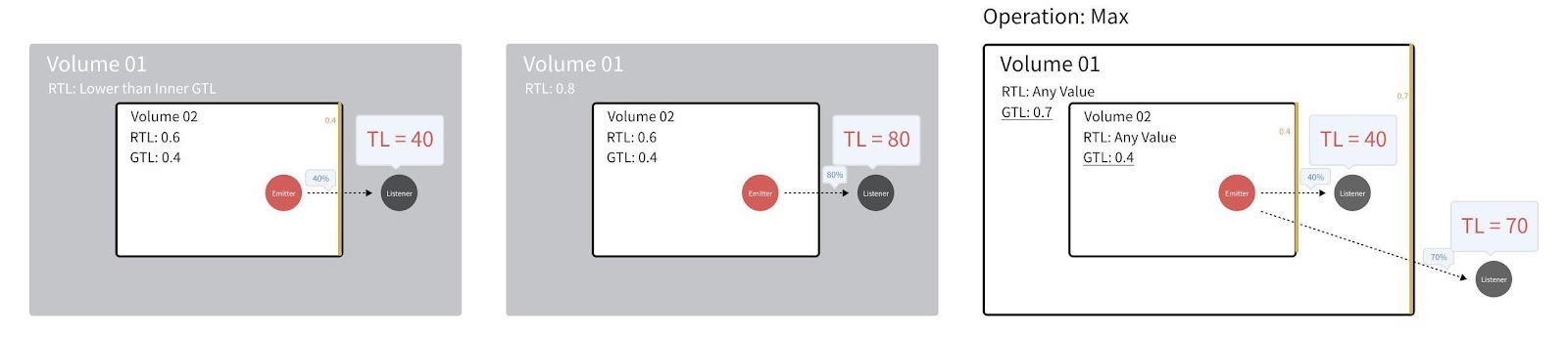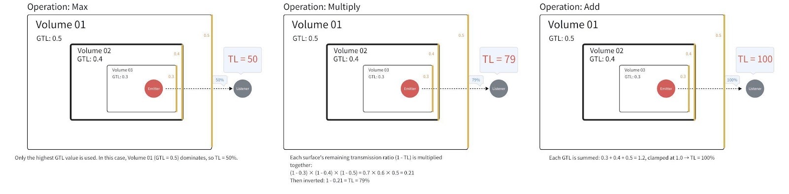 Prior to Wwise 2024.1, the default GTL operation was Max. Starting in 2024.1, the default can be changed via AkTransmissionOperation, giving designers more control over how layered materials behave – e.g., Multiply offers a smoother buildup of TL for semi-transparent media like glass or fabric.