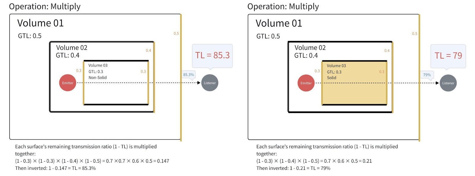 In this case, even though the outer volume has a higher GTL overall, the sound path still crosses only the same single surface — the boundary between Volume 02 and Volume 01, which now has a GTL of 0.3. Therefore, the resulting TL is 30%.