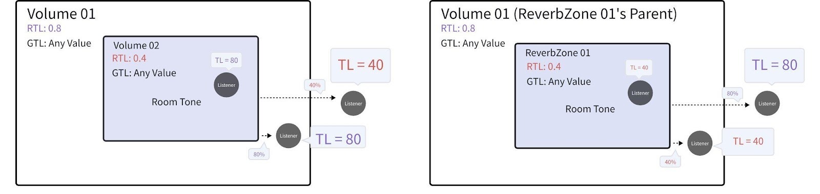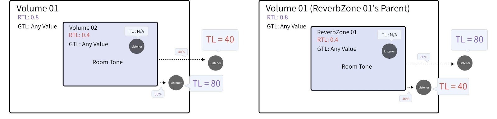 In scenarios involving Reverb Zones (where one room is nested inside another and assigned as a child of the outer room), the RTL of the inner Reverb Zone influences the Room Tone propagation, even when geometry is configured. This makes RTL a key factor in indirect sound simulation, particularly in nested room or Reverb Zone structures.