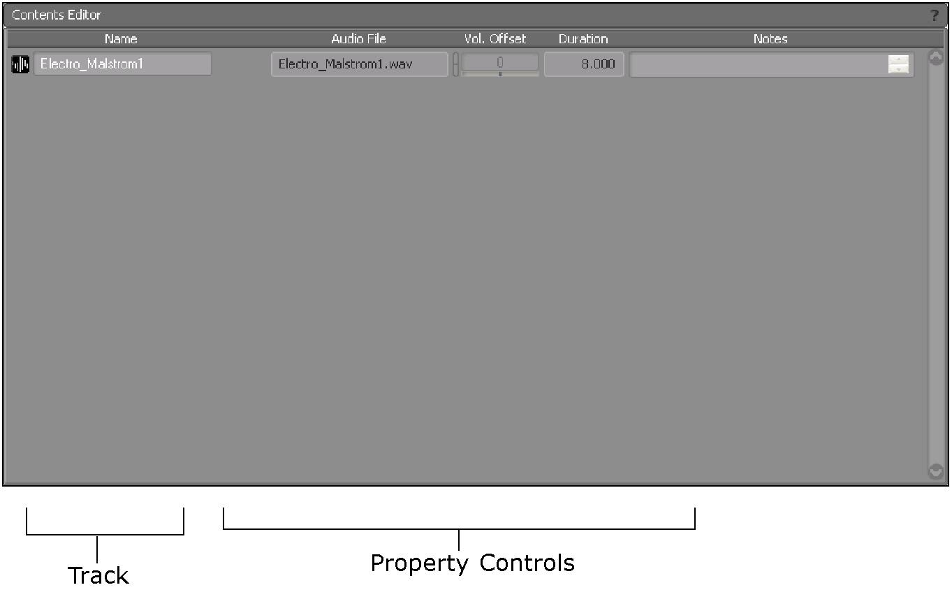 When you load a music track into the Property Editor, it is displayed in the Contents Editor. Its properties are displayed, but only its notes can be edited here.