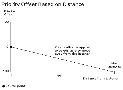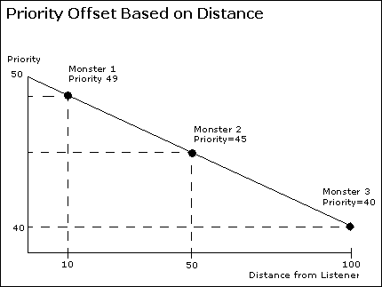 Because each monster is at a different distance from the listener and a priority offset based on distance is being applied, the priority for each sound will be different. The following graph shows how the distance from the listener will affect the priorities for each sound.