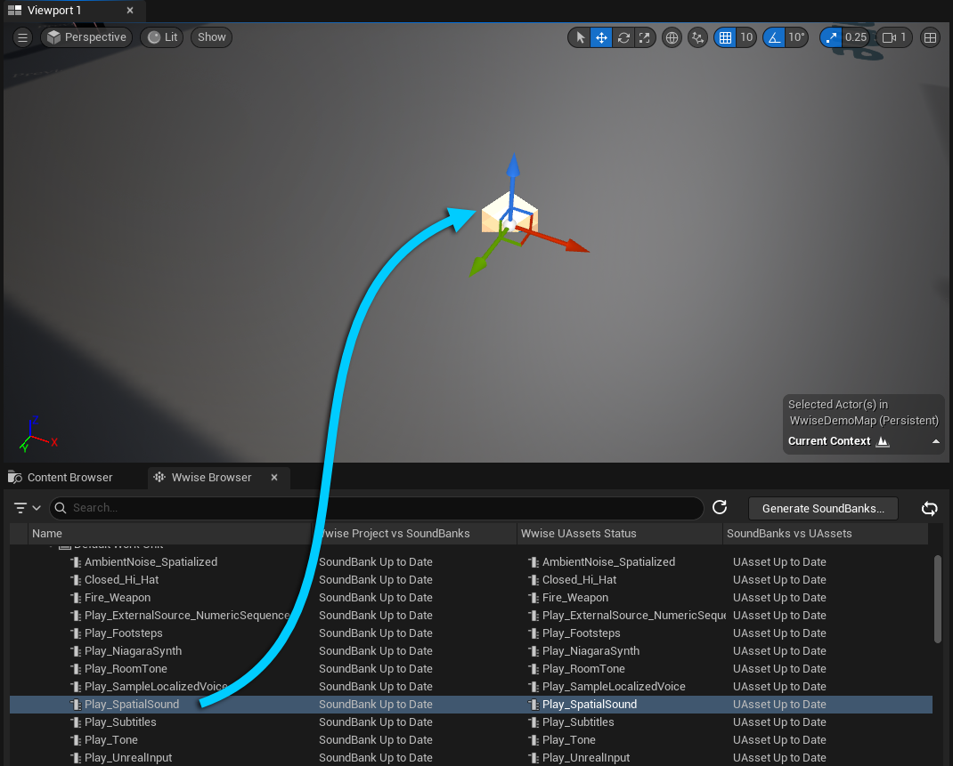 From the Wwise Browser, drag the Event that plays the ambient sound into the Level Editor. An AkAmbientSound Actor is created in the level, and a uasset of the Event is created in the Default Asset Creation Path.
