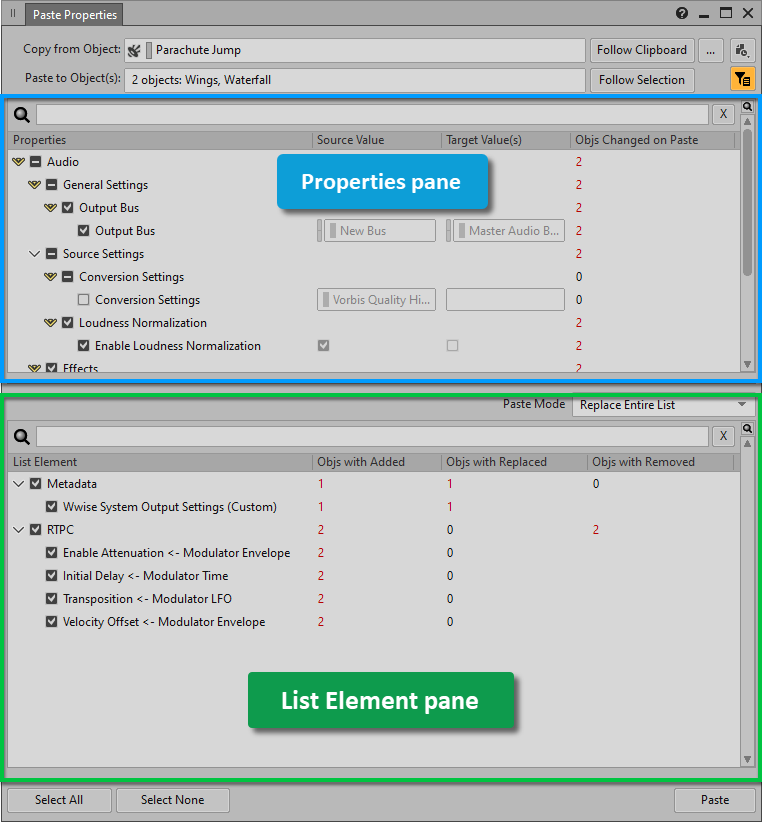 The Properties pane in the top half of the view lists the object properties in the source object. Similarly, the List Element pane displays any RTPCs, Metadata, Stingers, or Music Cues in the source object. The columns at the right of each pane display the number of objects that will change when you click Paste.