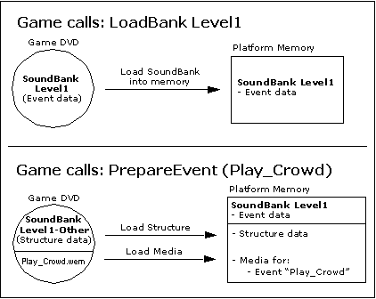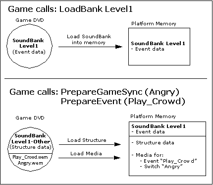 This method uses memory efficiently but performs more disk seeking than other methods, which might not be appropriate in situations when many files are already being streamed from the disk. Also, if the game uses States and Switches, media files could be loaded into memory unnecessarily. For example, if there are different sounds for the different moods or energy levels of a crowd in your game, they are all loaded into memory even if only some of the Switch sounds are valid within a particular zone of the game. To avoid this problem, you can prepare specific States or Switches that only load the media files associated with the prepared States or Switches.