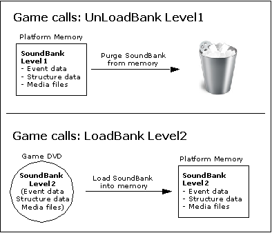 The following illustration demonstrates how SoundBanks created using the traditional method are loaded and unloaded from platform memory as the player moves from Level 1 to the Level 2 in the game.